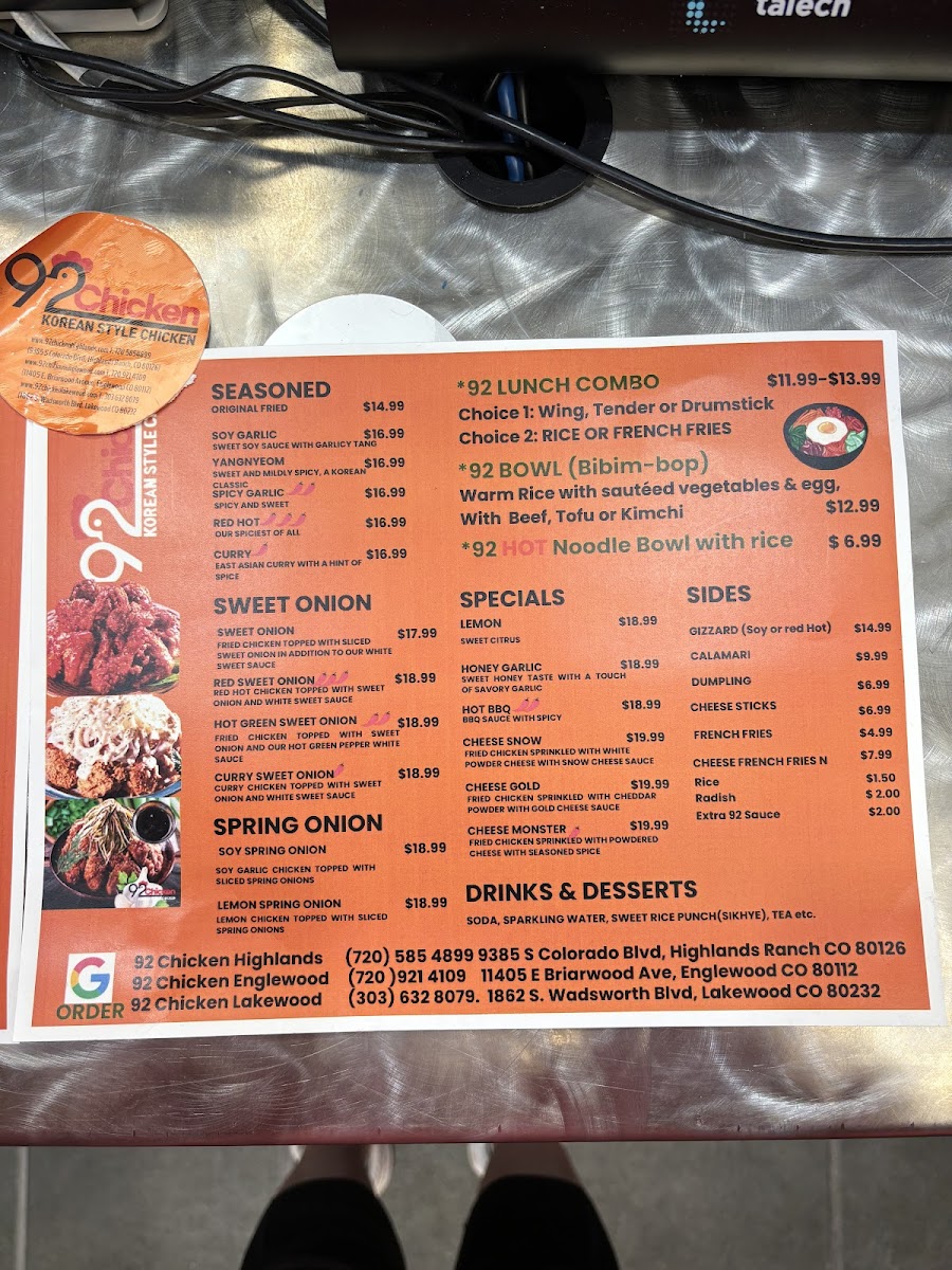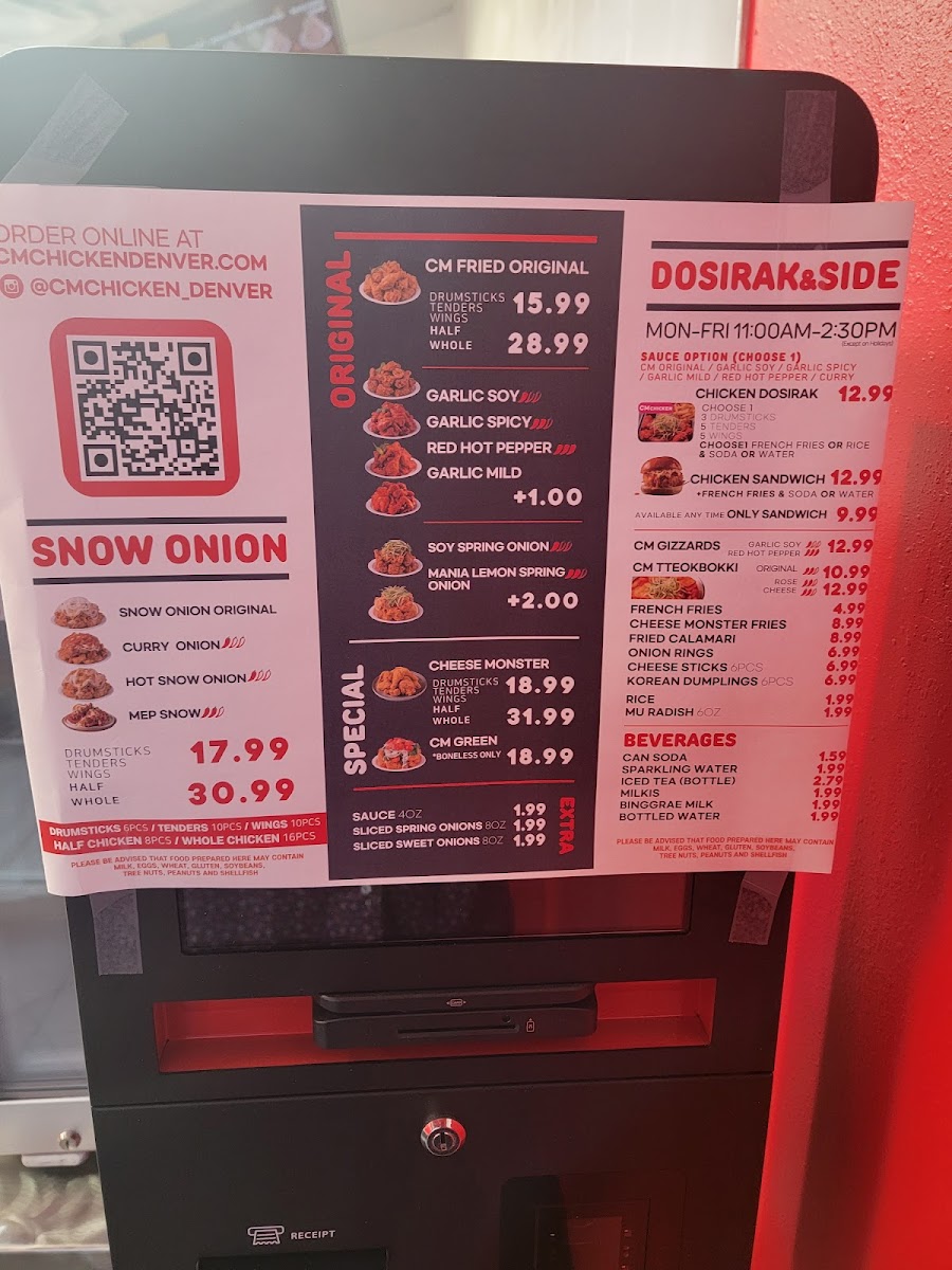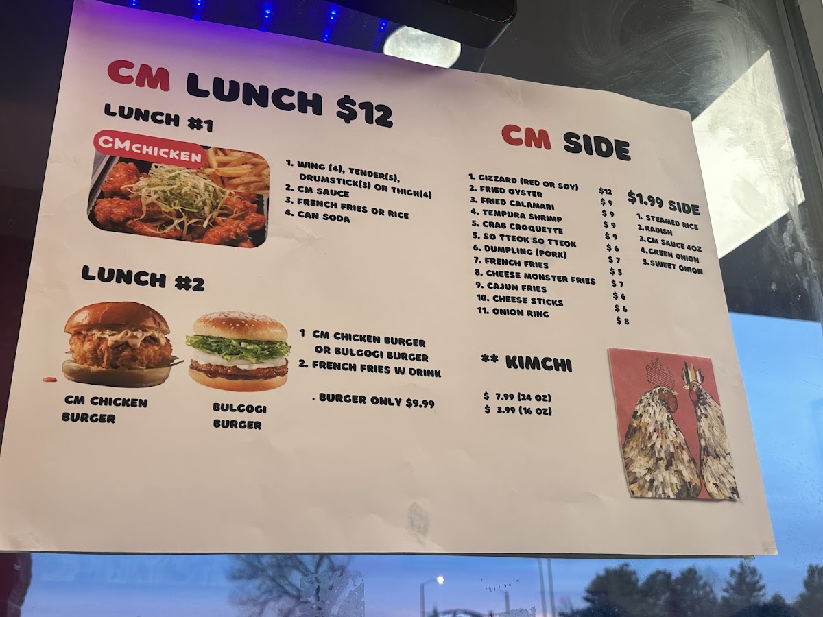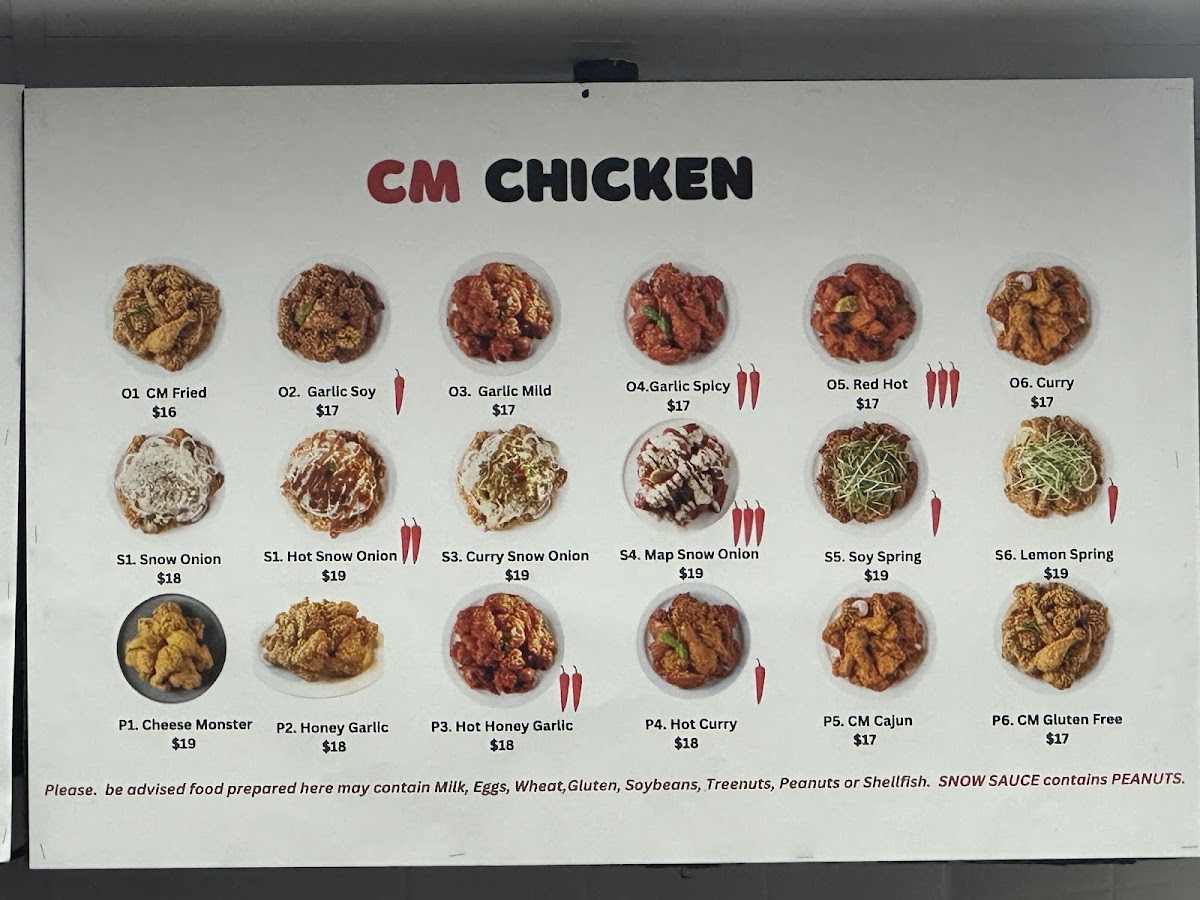 From a reviewer’s perspective, the menu at Cm Chicken Highlands Ranch offers a diverse and flavorful selection that caters to both adventurous and classic tastes. The Specials like Hot Honey Chicken, Cheese Monster Special, and Hot BBQ ChickenCM Green bring bold, indulgent flavors, while the CM Cajun Chicken adds a spiced, smoky touch. The Original Snowonion Series-including S1. Snow Onion Original, S2. Curry Onion, S3. Hot Snow Onion, and S4. Mep Snow-showcases a creative twist on the traditional snow onion flavor profile. For fans of the Tikkudak style, options like T1. Garlic Soy Tikkudak, T2. Red Hot Pepper Tikkudak, T4. Garlic Tikkudak, T5. Tikku Red Hot Pepper Gizzards, and T6. Tikku Garlic Soy Gizzards provide a mix of garlicky, spicy, and savory experiences. The Originals-from Garlic Mild (Yangnyeom) and Curry Chicken to Red Hot Pepper ChickenGarlic Spicy and Garlic Soy-offer familiar comfort with nuanced seasoning. Fans of onion-based dishes can enjoy the Snow Onion and Spring Onion categories, such as Curry Snow Onion, Hot Snow Onion, Snow Onion OriginalMep Snow, Mania Lemon Spring Onion, and Soy Garlic Spring Onion, which bring freshness and zest. For lighter meals or on-the-go options, the Dosirak Lunch Specials like D1. Chicken Dorisak and D2. Dorisak Sandwich are convenient yet satisfying. The K-Food section features classic Korean favorites, including Bibim-Bop, Chicken Katsu, Kimchi Fried RiceFried Rice, and Beef Bulgogi Bowl, while the Side Menus-from Truffle Fries and Hotteok to Korean Dumplings 8 Pieces, Coleslaw 8oz, and Popcorn Shrimp-offer shareable bites and complementary flavors. Beverages like Can Soda, Bottle Water, and Binggrae MilkMilkis round out the menu, ensuring both indulgent and refreshing options. Overall, the menu balances creativity, tradition, and variety, making Cm Chicken Highlands Ranch a compelling spot for anyone craving bold Korean-inspired flavors.
